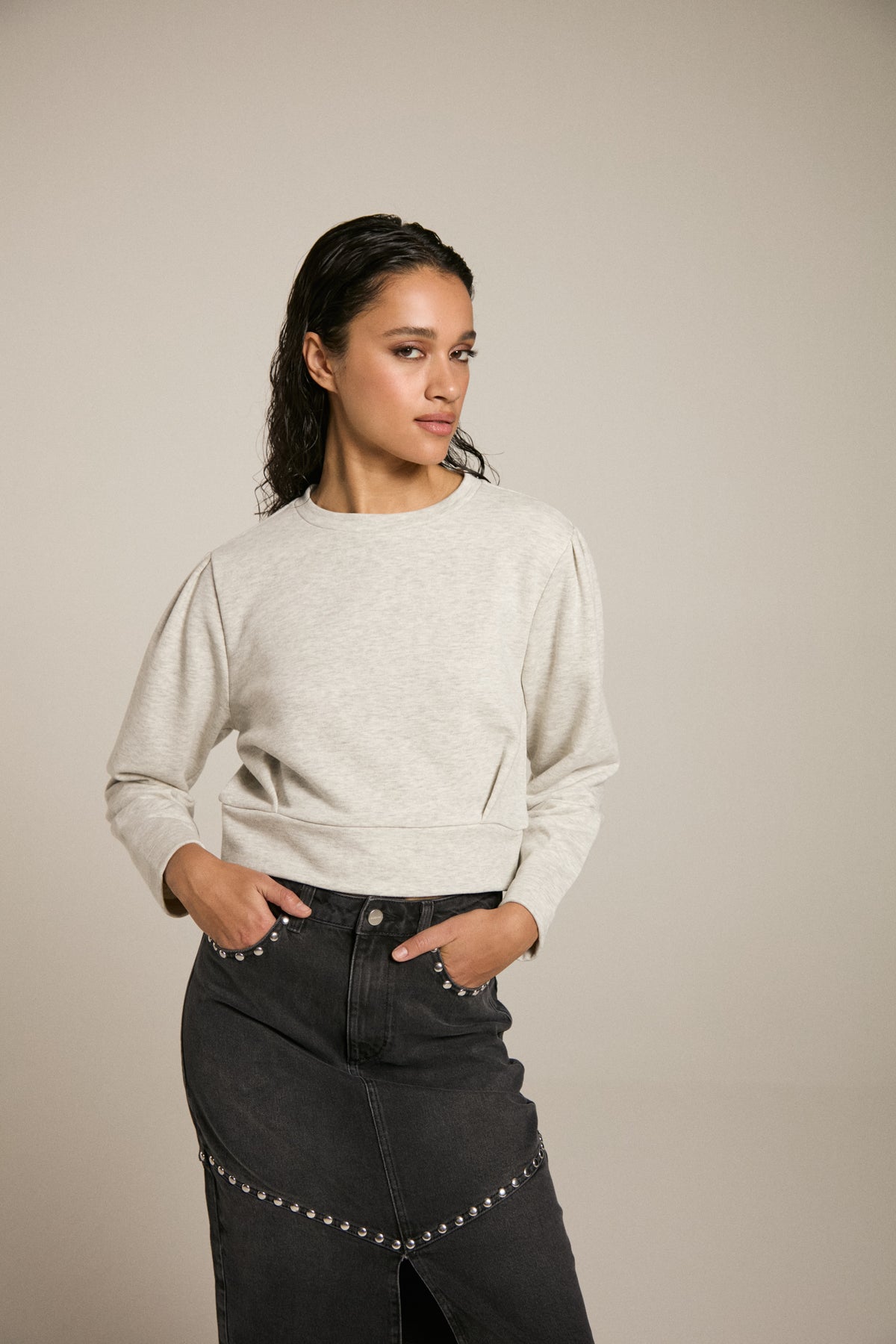De Cropped Sweater in Ecru Melange is gemaakt van 100% biologisch katoen voor een zachte, ademende feel die ook vriendelijk is voor de planeet. Met een relaxed pasvorm en cropped design is deze trui perfect te combineren met een high-waisted jeans of rok. Het resultaat: een nonchalante maar modieuze look die het hele jaar door past.