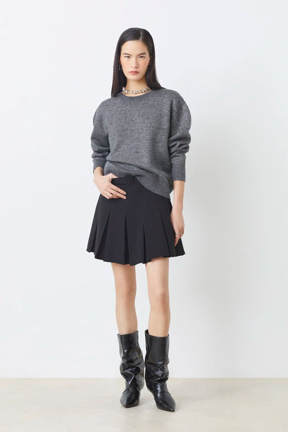 Breng een vleugje glamour in je look met deze lurex trui met open rugdetail. De subtiele glans van de stof zorgt voor een elegante uitstraling, terwijl het gekruiste rugontwerp een verrassend en vrouwelijk accent toevoegt. Afgewerkt met een ronde hals en lange mouwen voor een tijdloze balans tussen stijl en comfort.