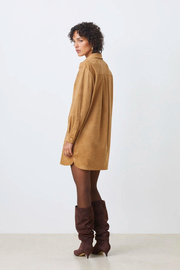 Deze korte jurk van imitatie-suède is een must-have voor je garderobe. De jurk is gemaakt van 100% gerecycled polyester en heeft een klassieke overhemdkraag, lange mouwen en een drukknoopsluiting aan de voorkant voor een moderne, comfortabele fit. Perfect om casual te dragen of te stylen voor een chique look.