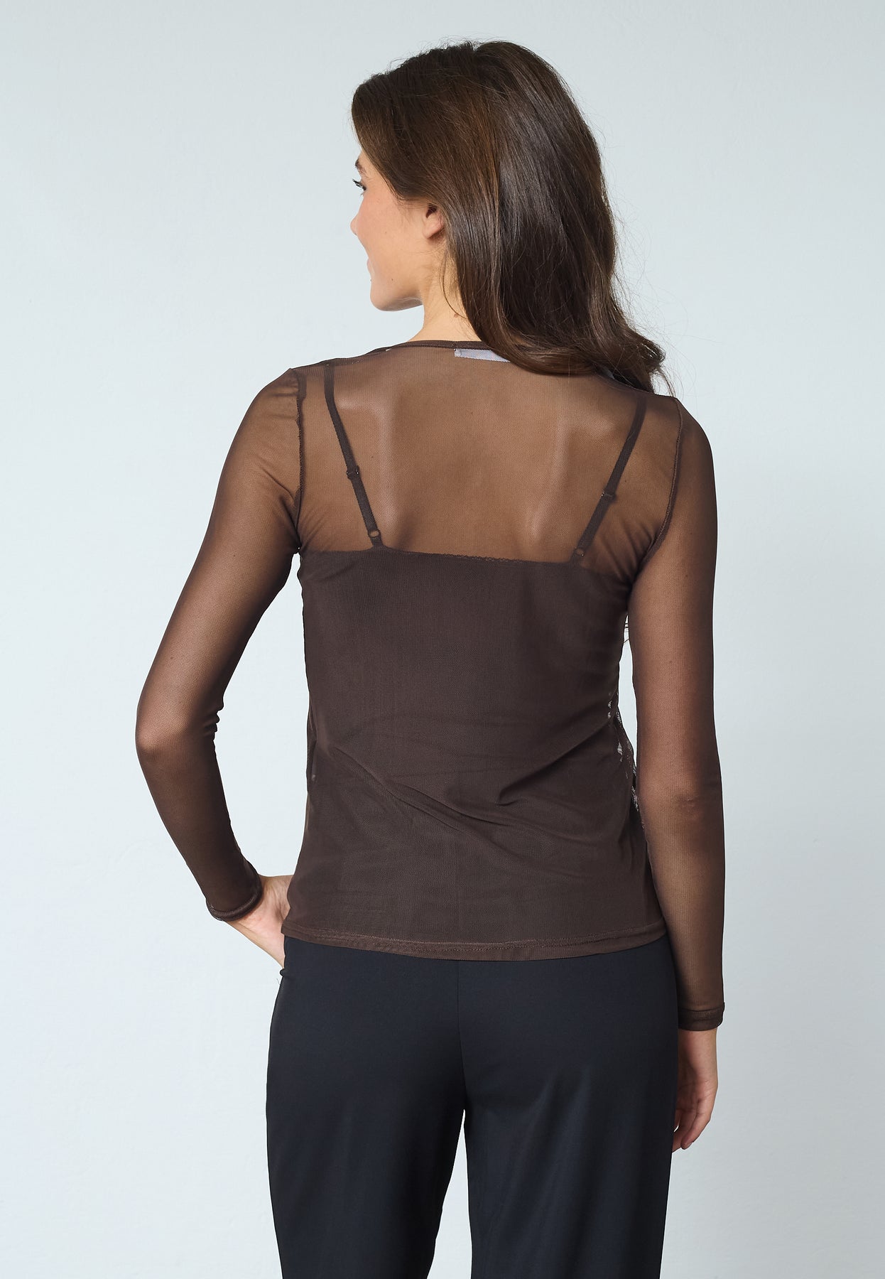 De Gani top is een verfijnde, longsleeve mesh top met een transparante buitenlaag die de huid subtiel laat doorschijnen voor een elegante, moderne look. De boothals geeft het ontwerp een zachte, vrouwelijke vorm, terwijl de lichte stof moeiteloos meebeweegt. Een perfecte layering piece voor zowel chique avondlooks als eigentijdse casual outfits.