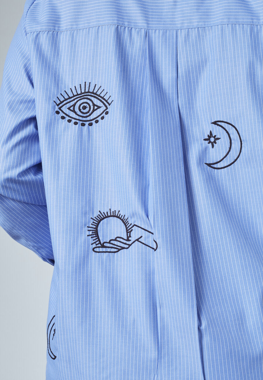 De blouse is een gestreept overhemd met lange mouwen en een klassieke kraag. Versierd met geborduurde, grafische motieven en voorzien van een volledige knoopsluiting voor een verfijnde look.