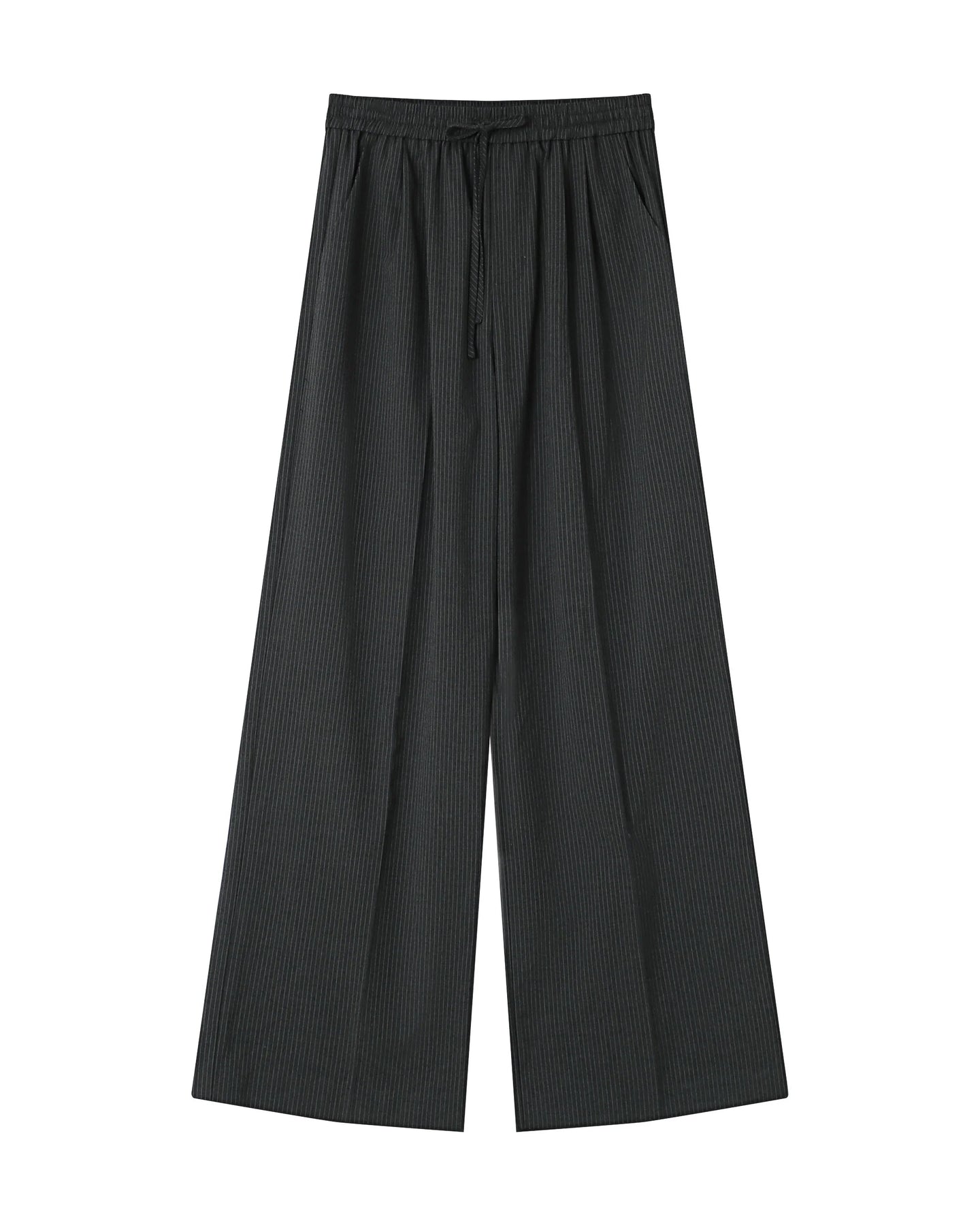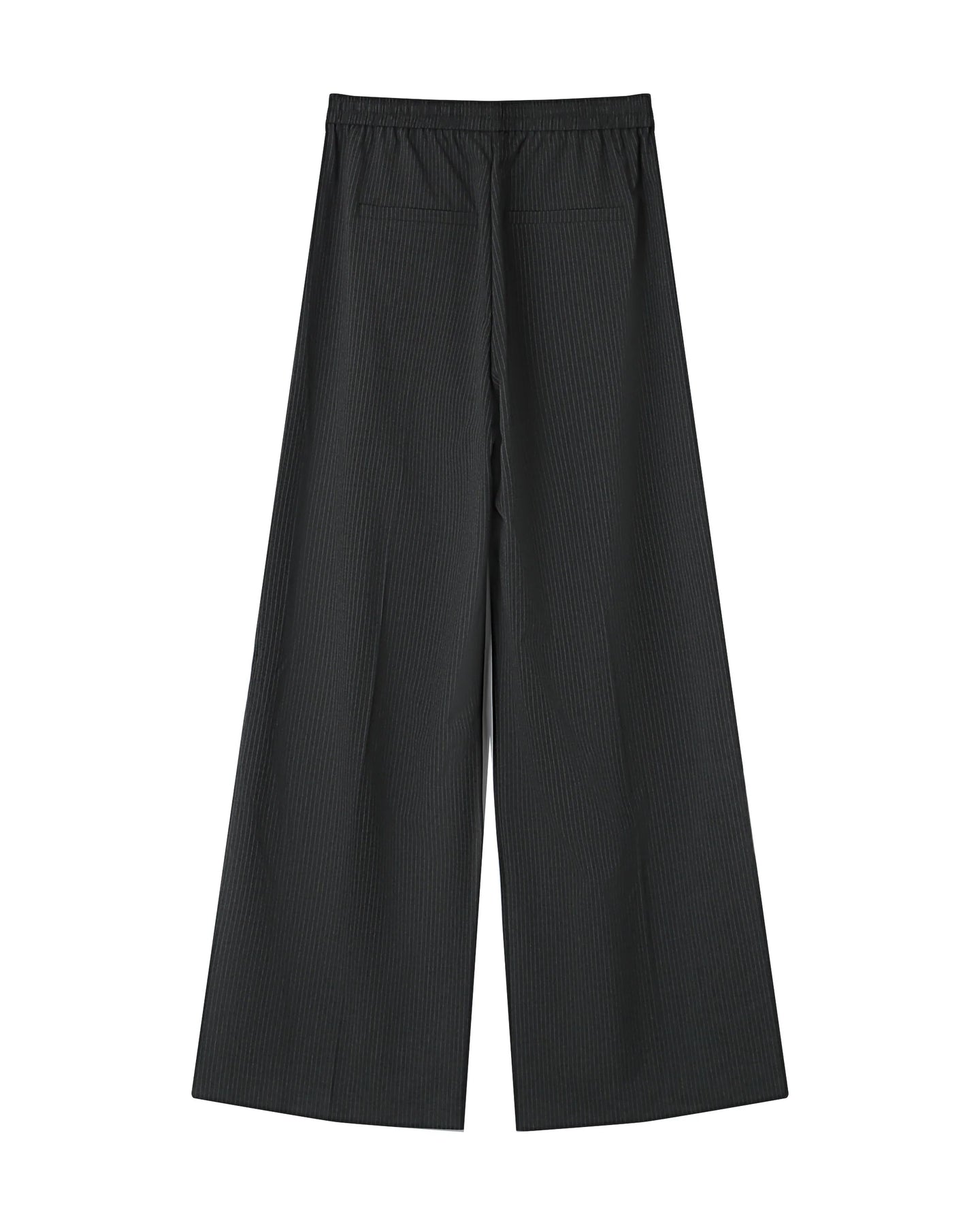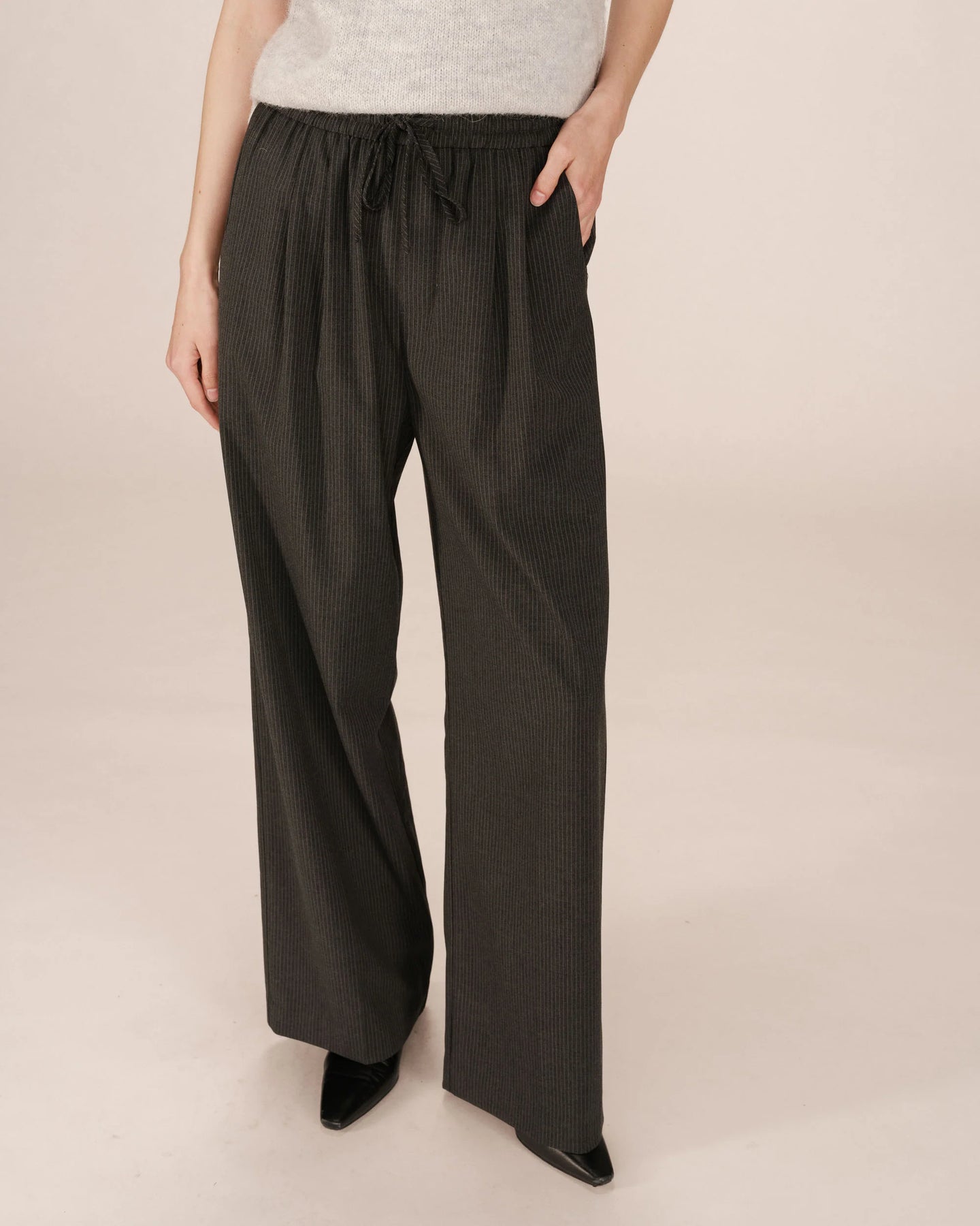 De rechte, wijde pijpen creëren een ontspannen silhouet, terwijl de elastische taille met verstelbaar koord zorgt voor een comfortabele pasvorm. De persvouwen aan de voorkant en paspelzakken achter verwijzen naar klassieke tailoring, maar met een moderne, moeiteloze twist. Een stijlvolle essential die zowel casual als chic gedragen kan worden.