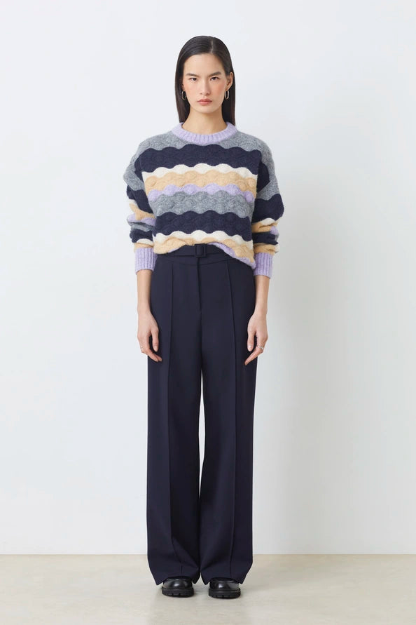 Voeg een speels accent toe aan je knitwearcollectie met deze gestreepte trui met golvende, meerkleurige strepen. De ronde halslijn en lange mouwen geven de trui een klassieke uitstraling, terwijl het scalloped patroon zorgt voor een eigentijdse twist.